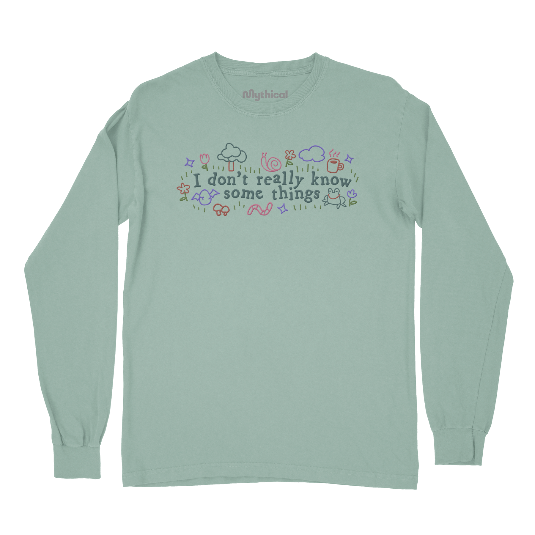 Long sleeve tee with "I don't really know some things" text, a snail, flower, frog, worm and cloud designs.