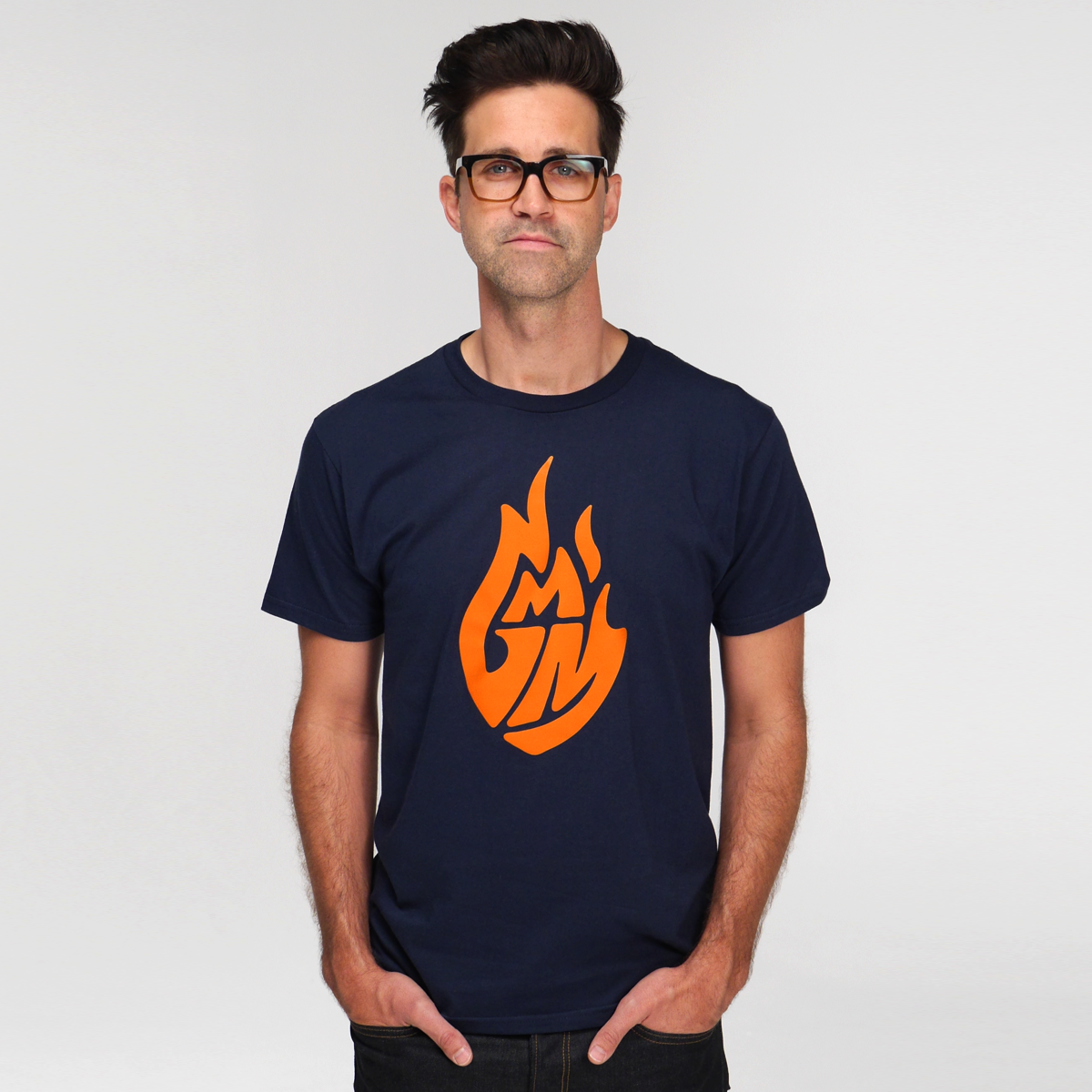 Good Mythical Morning Logo Tee in front view. Navy t-shirt with Good Mythical Morning logo in orange.