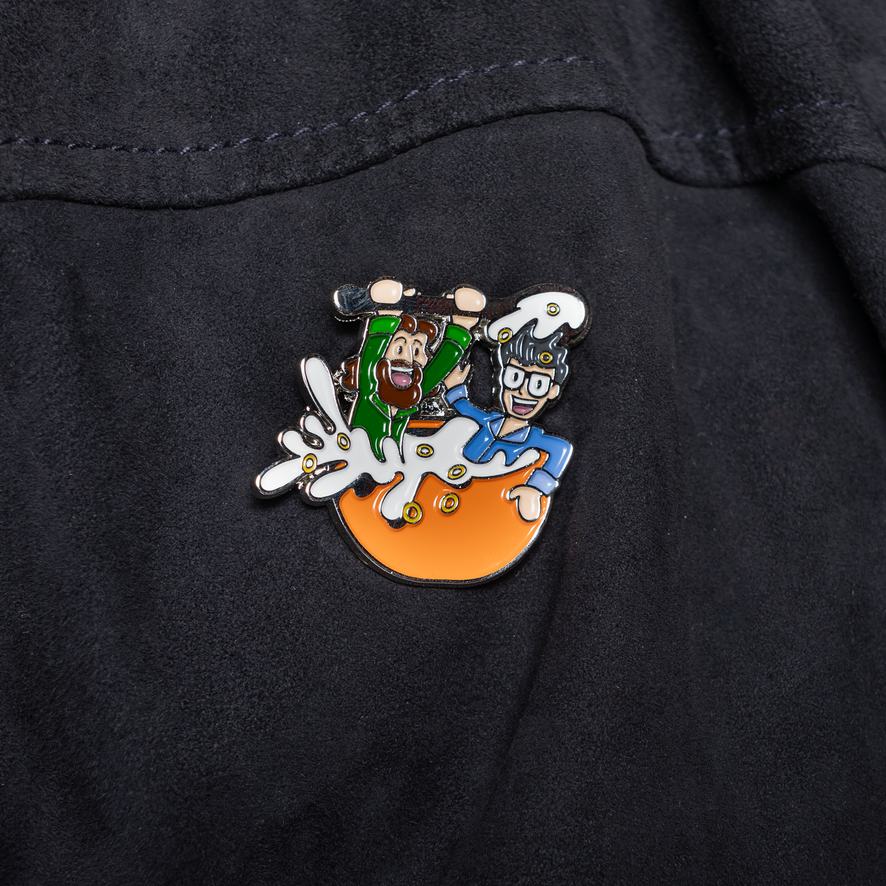 Rhett & Link's Giant Cereal Bowl Bath Pin of the Month featuring Rhett and Link in a cereal bowl.