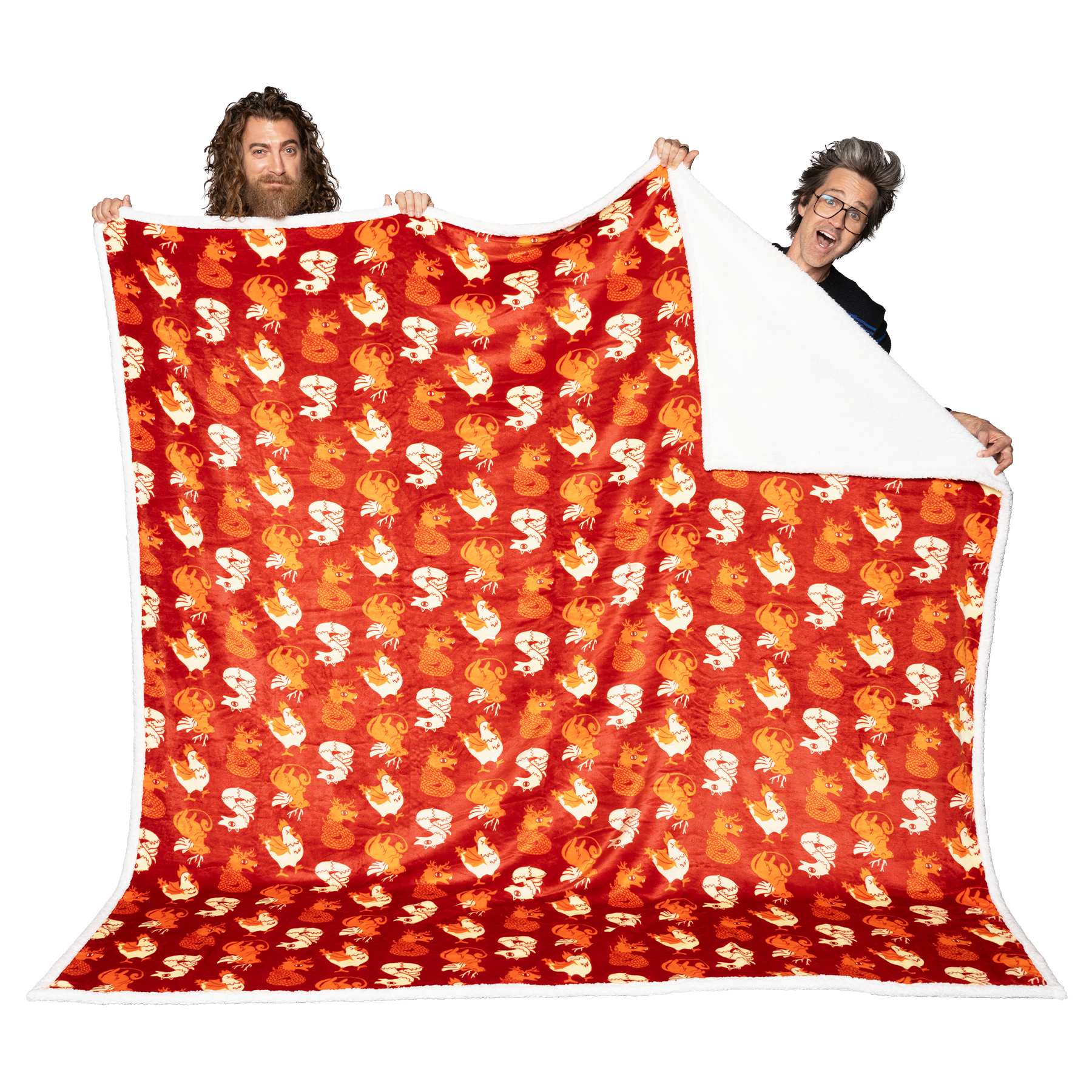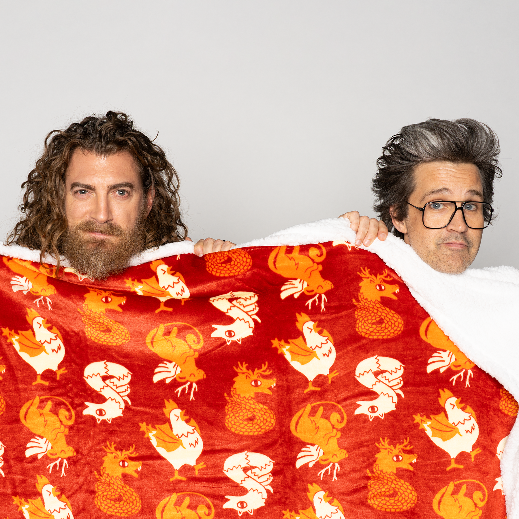 - Front side: red, orange, and tan Mythical Beasts pattern of the Randler, Belvedere, and Mythical Society Serpent