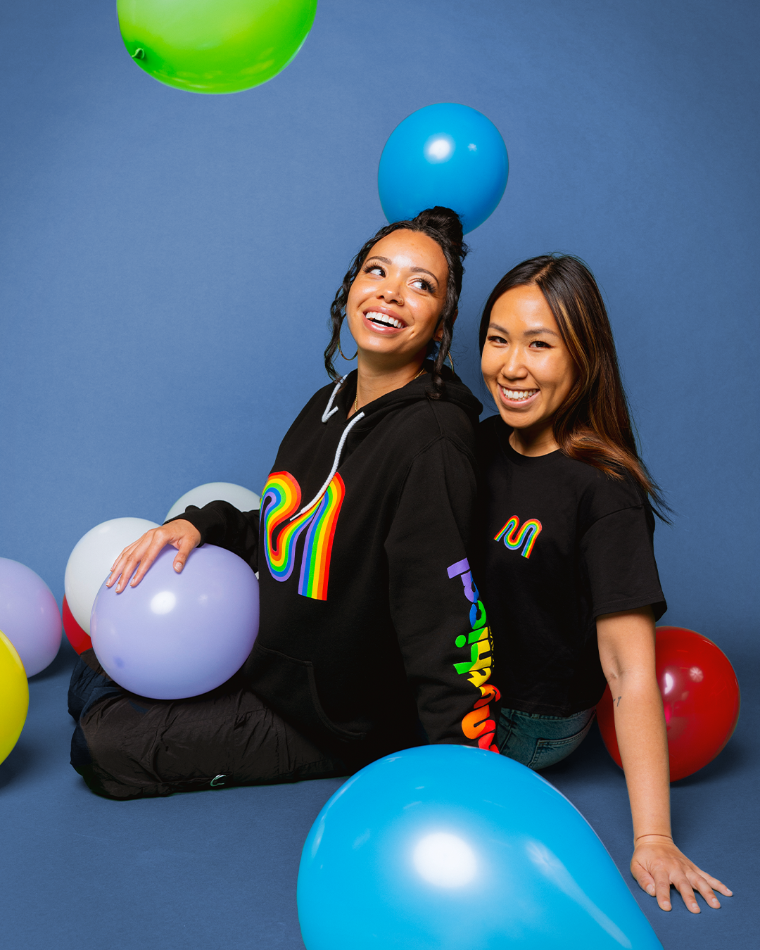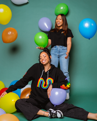 Two people wearing a black t-shirt and hoodie with a rainbow-colored "M" design surrounded by balloons.